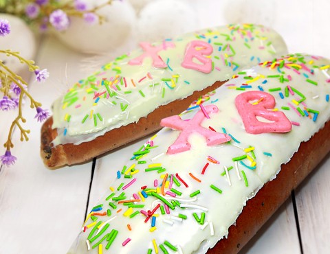 Мука в\с, сахар, молоко цельное, дрожжи, маргарин, изюм, цукаты, абрикосовая косточка, яйца, соль, ванилин, гель, посыпка, яйца варёные крашеные.