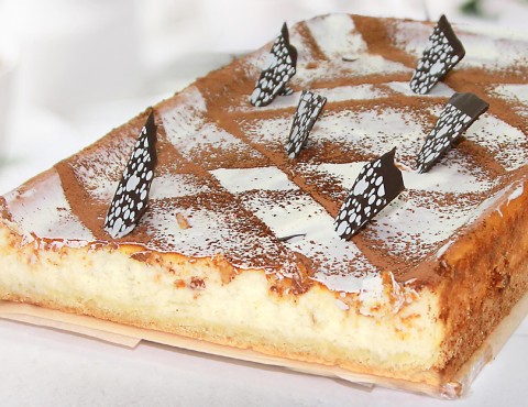 Мука в\с, сахар, крахмал пшеничный, яйцо, какао, соль, разрыхлитель, сливочно заварной крем со вкусом творога, конфитюр вишнёвый, посыпка вермишель шоколадная, крем Новелла какао, крем Новелла белая.