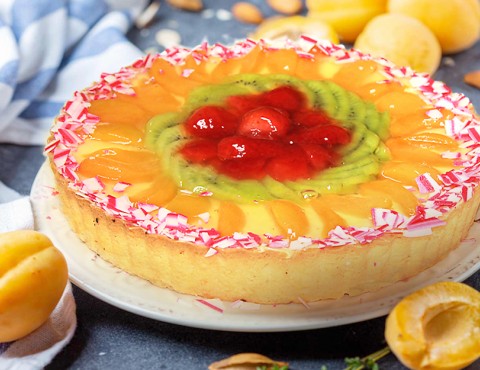 Песочная основа, глазурь кондитерская шоколадная, заварной крем, клубника с\м, киви, абрикос консервированный, желе, коробка.
