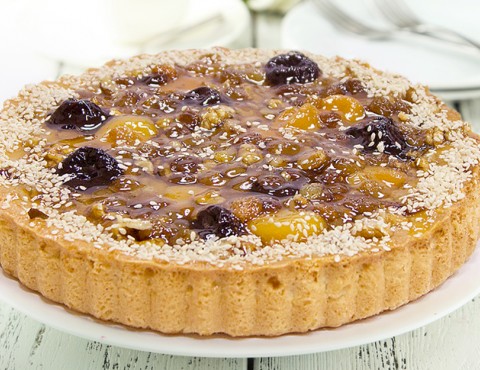 Песочная основа, заварной крем, начинка карамельная, чернослив, курага, изюм, орех грецкий, кунжут, коробка.